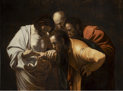 イタリア・バロックの巨匠、カラヴァッジョが1601年~1602年頃製作した絵画はこの物語の劇的瞬間をとらえた作品です。聖書にはトマスが実際にキリストの傷に手を入れたということは記されていません。しかしこの作品では、主イエスが、トマスの手を取って人差し指を傷に入れさせているように描かれています。そして他に二人の弟子もキリストの脇腹の傷口に注目しています。「信じない者」が「信じる者」になる瞬間をとらえています。ユダヤ人に襲われるかもしれないという恐怖から、主の復活を信じる喜びへと変わっていった瞬間です。