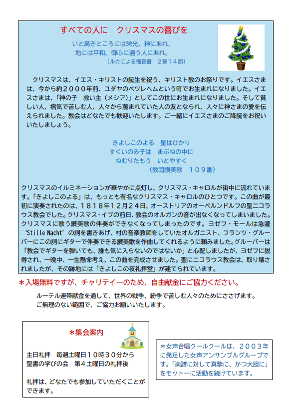 特別なイベント 12月20日(土)15:00 「愛と平和のクリスマスコンサート」 2025.11.21 12月20日(土)15:00 「愛と平和のクリスマスコンサート」(入場無料) 指揮:河野 浩幸 ピアノ:大森 美樹 女声合唱:クール・クール